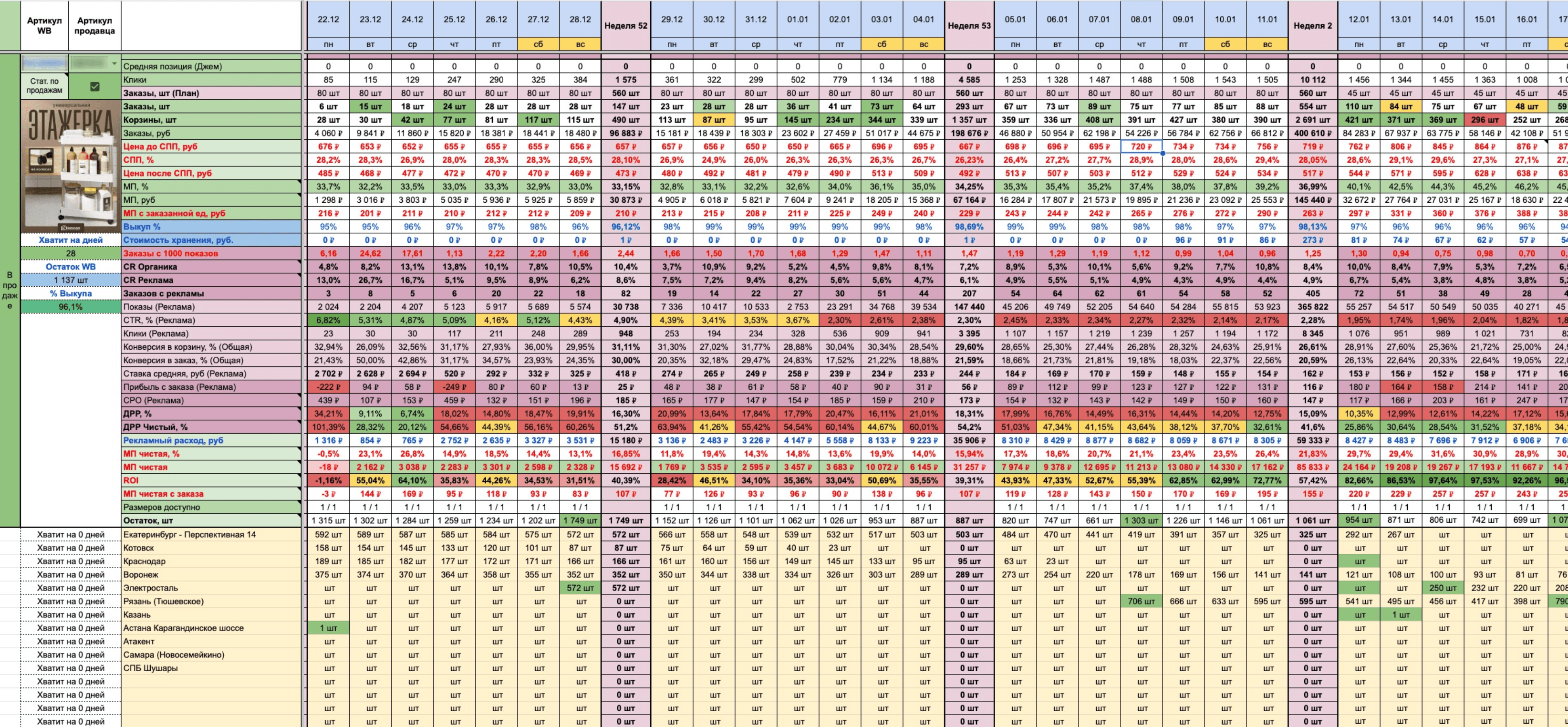 Заказы, трафик, конверсии, реклама, остатки и юнит-экономика по каждому SKU - все цифры собраны в одной таблице и обновляются каждый день.